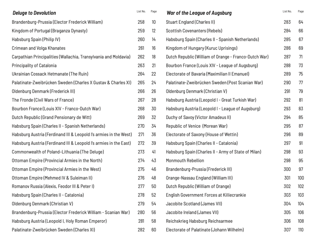 Renatio et Gloriam: The Sun King’s Wars contains list for European armies from 1640 to 1699, including – Bourbon France, Habsburg Austria & Spain, the Dutch Republic, Palatinate-Zweibrücken Sweden, Brandenburg-Prussia & Orange-Nassau England.