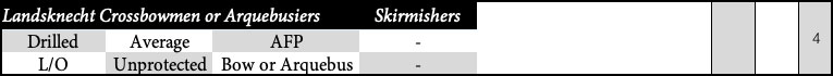 In the lists above, Landsknecte Arquebusiers can be alternatively armed with Crossbow. Replacing the Landsknechte Arquebusiers line with –